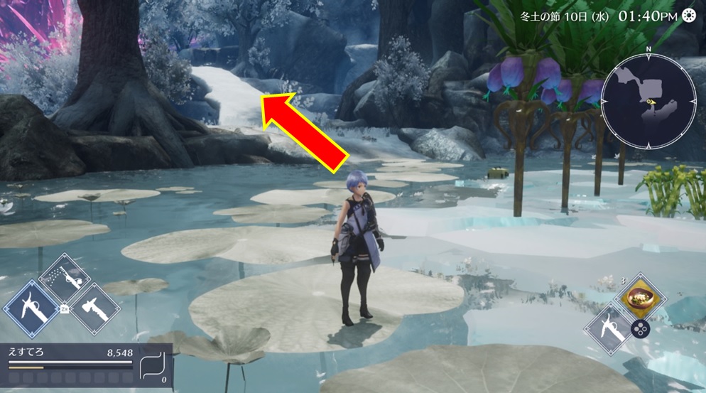 釣りの心得LV2の入手とヌシ釣り開始のタイミングは水辺バイオームが出来たあとです。水辺バイオームが完成した後に、水辺バイオーム奥の道を進んで行くとエリア3のあやしい池へとつながっています。