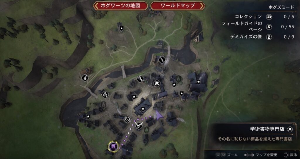 「学術書物専門店」「オリバンダーの店」「J・ピピンの魔法薬店」「マジックニープ」の4つのお店を回る。行く場所のアイコンにカーソルを合わせて「ウェイポイントを設定(×ボタン)」にすればルートが表示されるので迷わない。