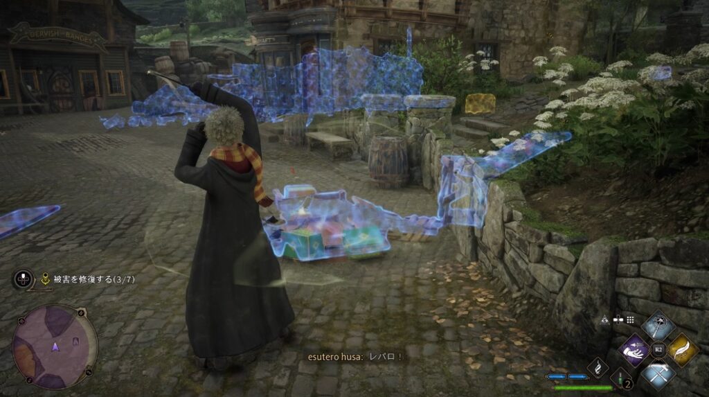 レパロで建物などを修復する(7か所)。場所が分かりにくい時はレベリオを使うと青く光るので分かりやすくなります。