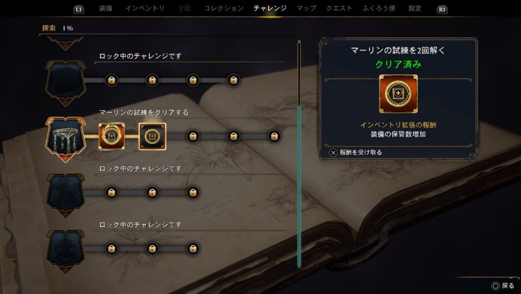 マーリンの試練を単発クリアで装備枠が増えるわけではなく、複数回クリアするごとにチャレンジの報酬として貰えるようになっています。最初のチャレンジは2回なのでメインクエストでクリアする分も合わせれば、どこかで1回クリアすれば初回の報酬が貰えることになります。