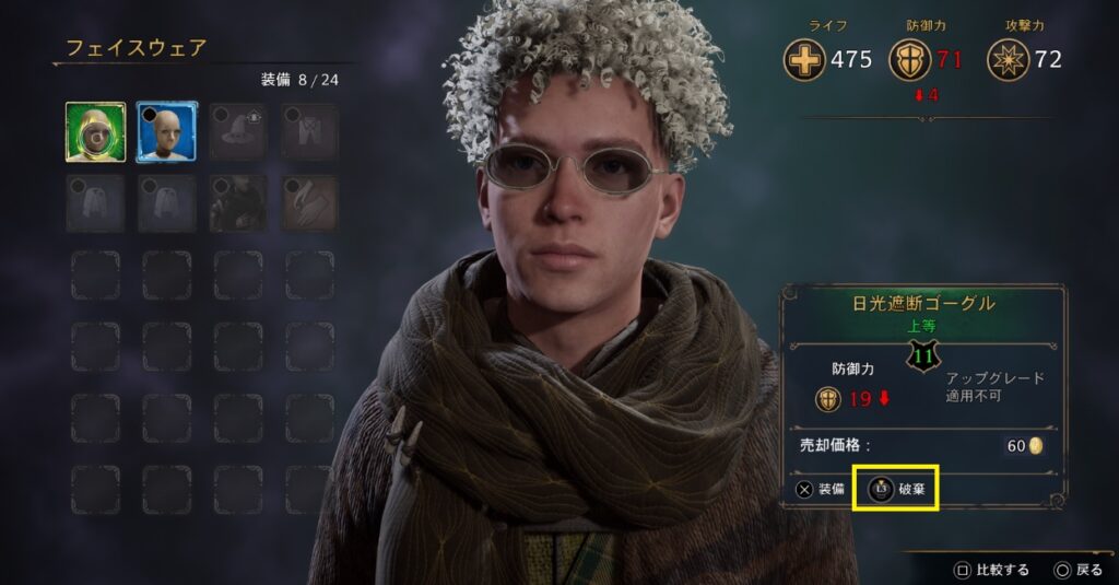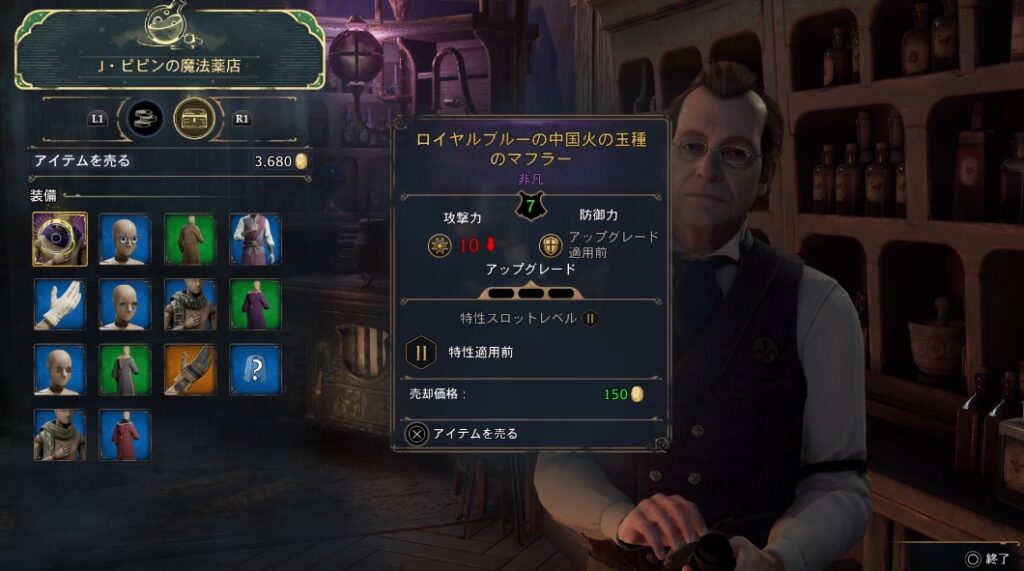 ホグズミードへ行ってお店で売却が出来ます。R1ボタンで売却に切替が出来るので要らない装備はこれで売ってしまいましょう。