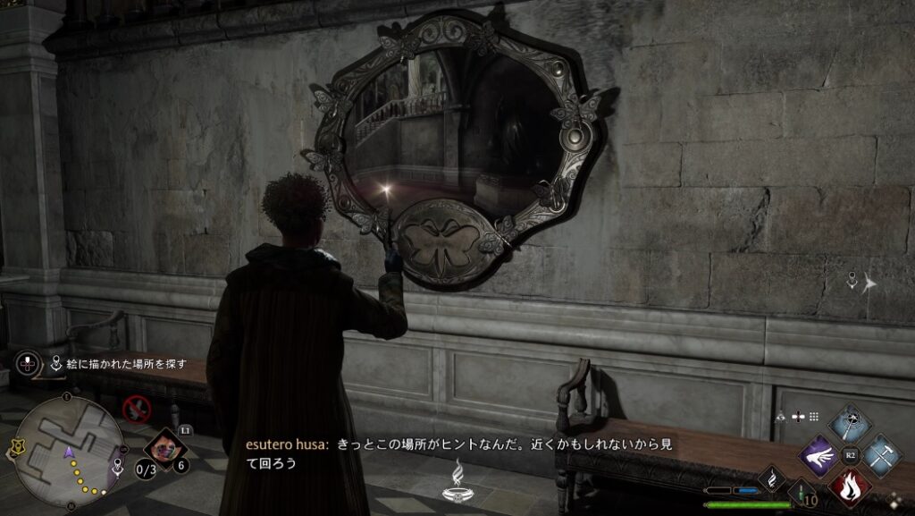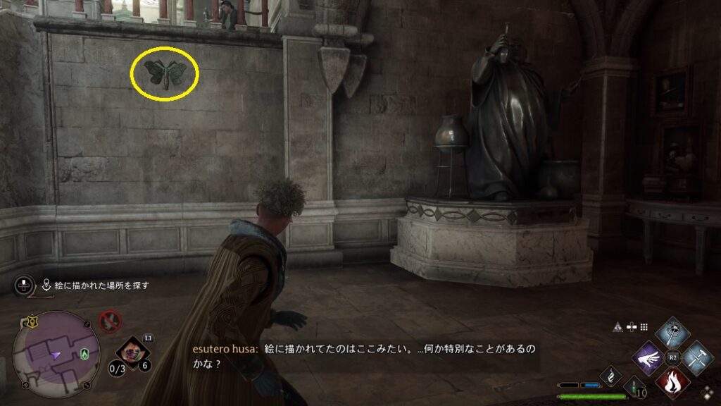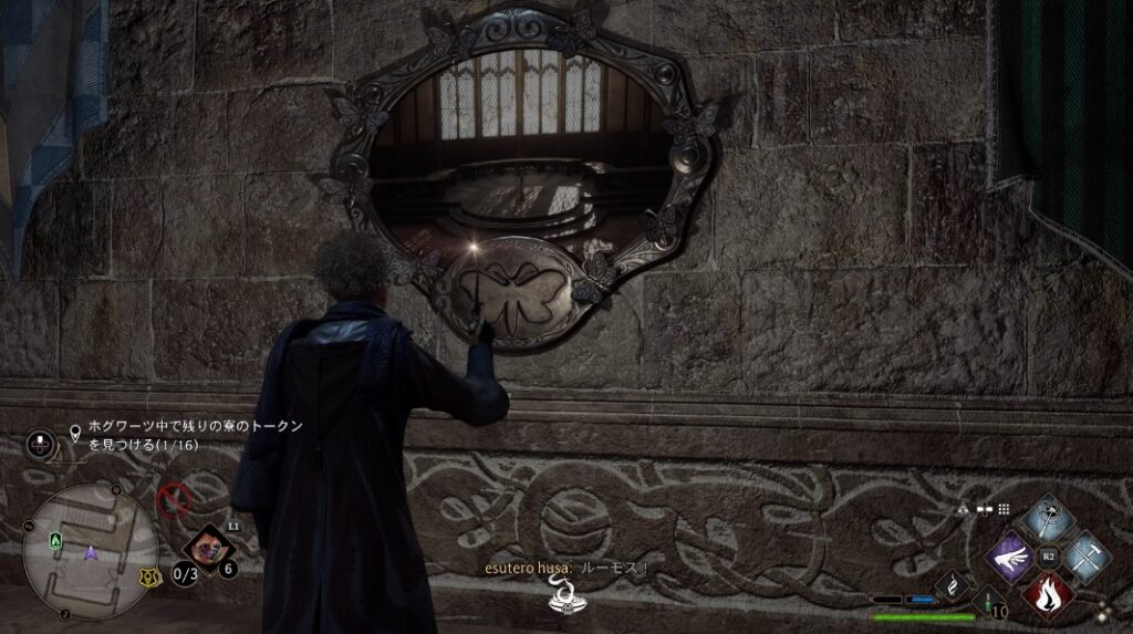 絵に描かれた場所を見つけ近くにいる蛾のそばでルーモスをする。今回はクエストなので目的地までナビが発生します。