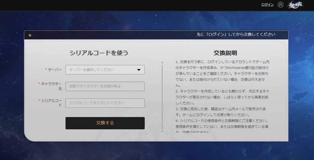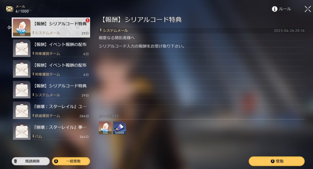 | STARRAILGIFT | 星玉×50、浪漫指南×2 缶入りカココーラ×5 信用ポイント×10000 | 4/30まで |