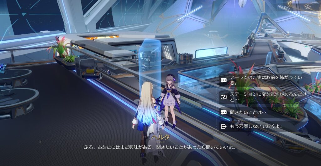 ヘルタは宇宙ステーションのいろいろな場所にいるので、どこかのヘルタに話かけると画像のように『ステーションに変な気泡があるんだけど…』という項目が発生するので、こちらを選んでヘルタから話を聞きます。