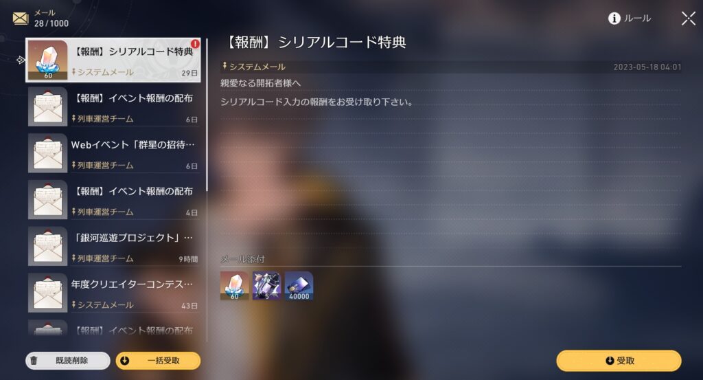 PC版でプレイしている人はゲーム内にシリアルコードの入力箇所があります。先ほどコピーしたコードを入力すればアイテムがゲーム内のメールで送られてきます。