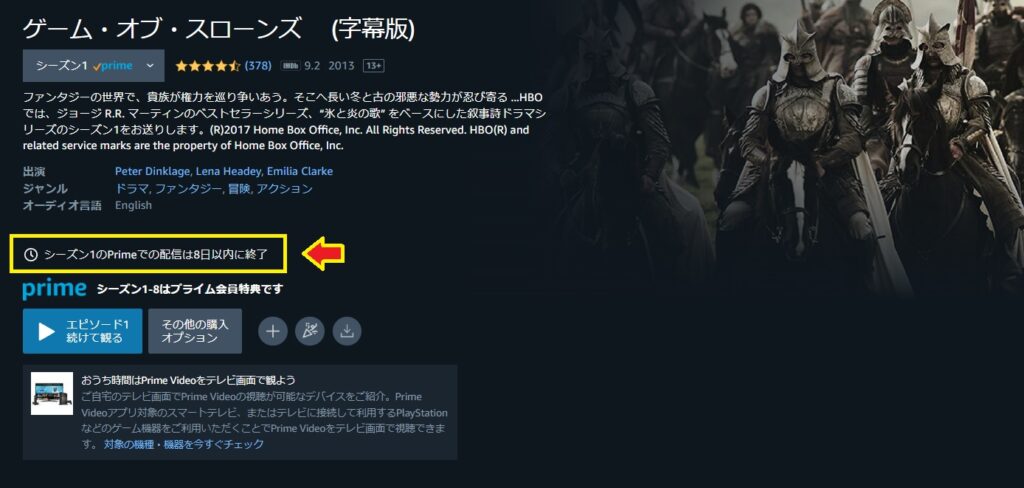 Amazonプライムでの見放題が10月15日をもって終了となるようです…。ゲームオブスローンズはシーズン1~8まであるかなり長い作品で、今までAmazonプライムで観ていた人にとっては死活問題です。