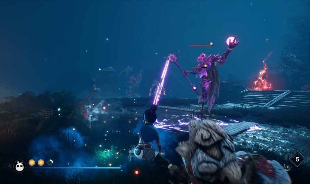 メイジ系の敵が使って来る紫色の攻撃は喰らうと体力が瀕死になります。その為、この攻撃を出される前に倒すか、強攻撃を当てて行動を妨害したい。メイジ系の敵はいやらしい行動が多いので、出てきたら率先して倒したいところ。