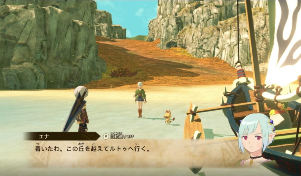 前のパートで船に乗ってエナが住む村にいくところからスタート。基本的には、マップに表示される目的地マークを目指して移動すればOK