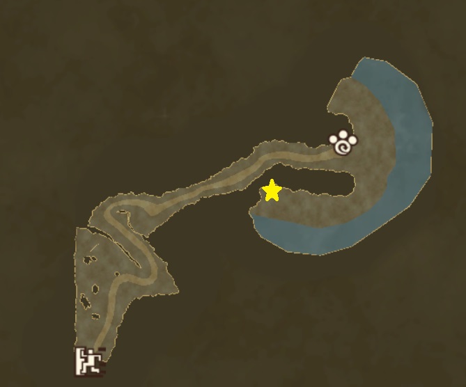 ただ、海岸沿いに宝箱がある(画像の★の場所)ので、村の方面へ行く前に回収しておくとスムーズ。中身は【火事小の護石】。