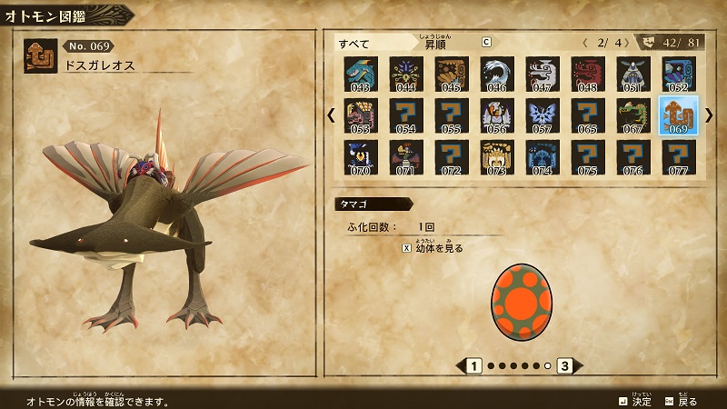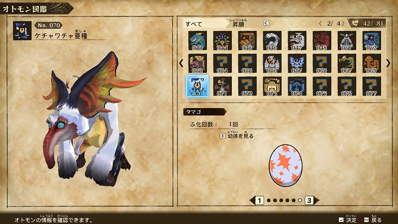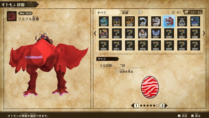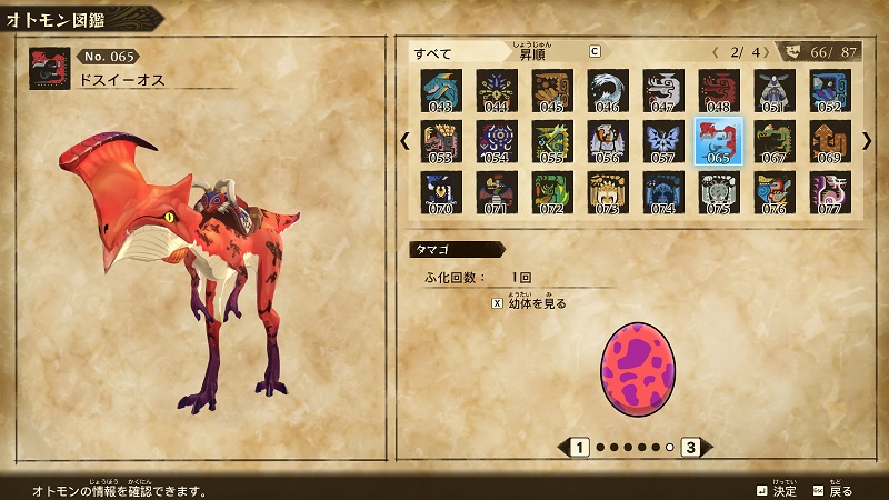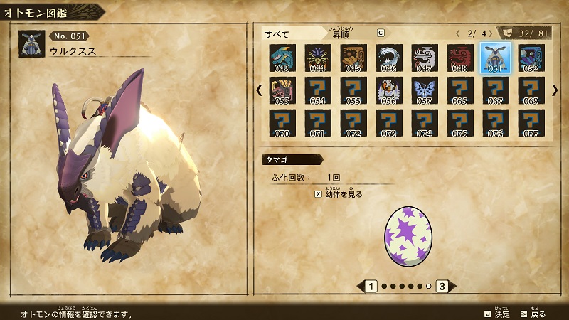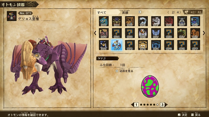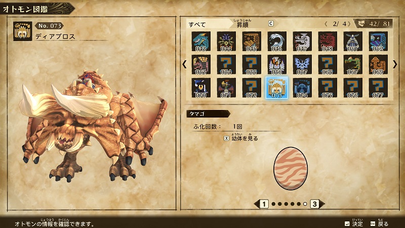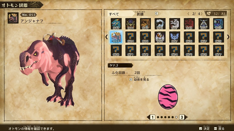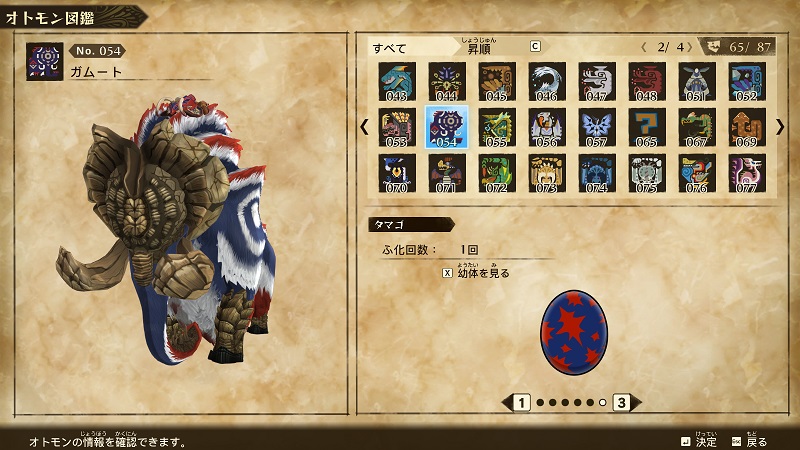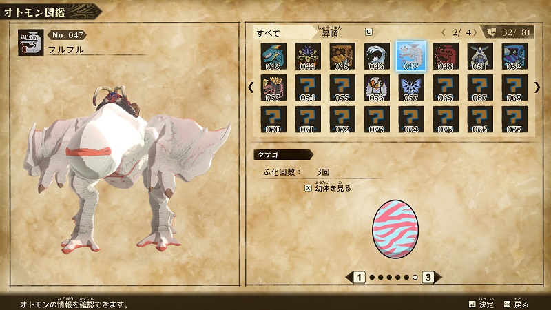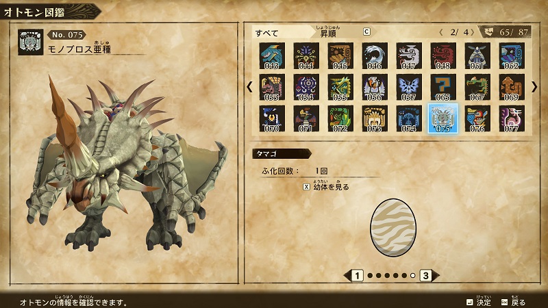 【コンプ済】オトモン図鑑NO.043~077[タマゴの模様・色判別用]【モンハンストーリーズ2】