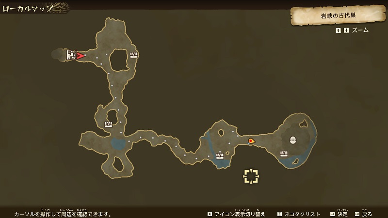 マップ内にある古代巣に立ち寄る人は「ジャンプ」「岩砕き」「ツタ登り」が出来るオトモンを連れていきましょう。それで全ての宝箱を回収できます。