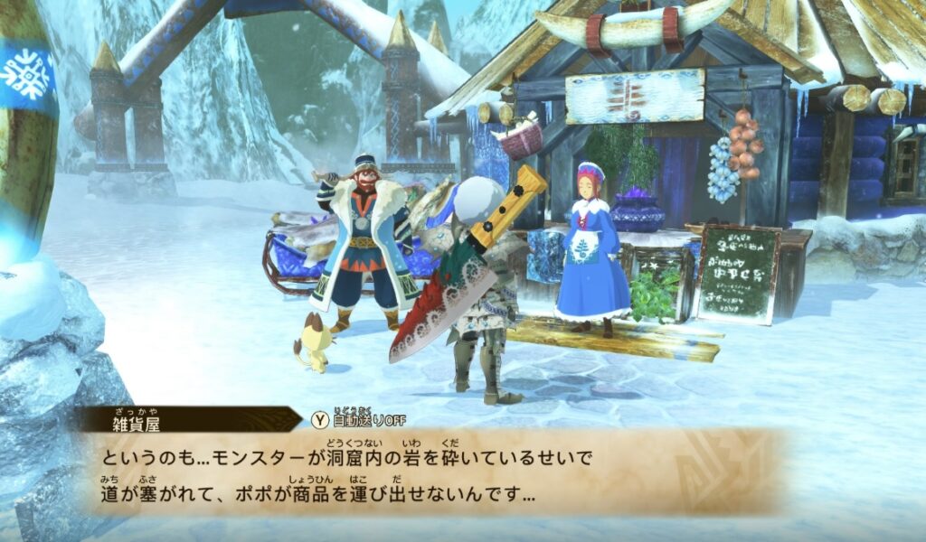モンスターに洞窟内の道を塞がれ、商品が運び出せないと言う雑貨屋の為に、主人公は人肌脱ぐことに。