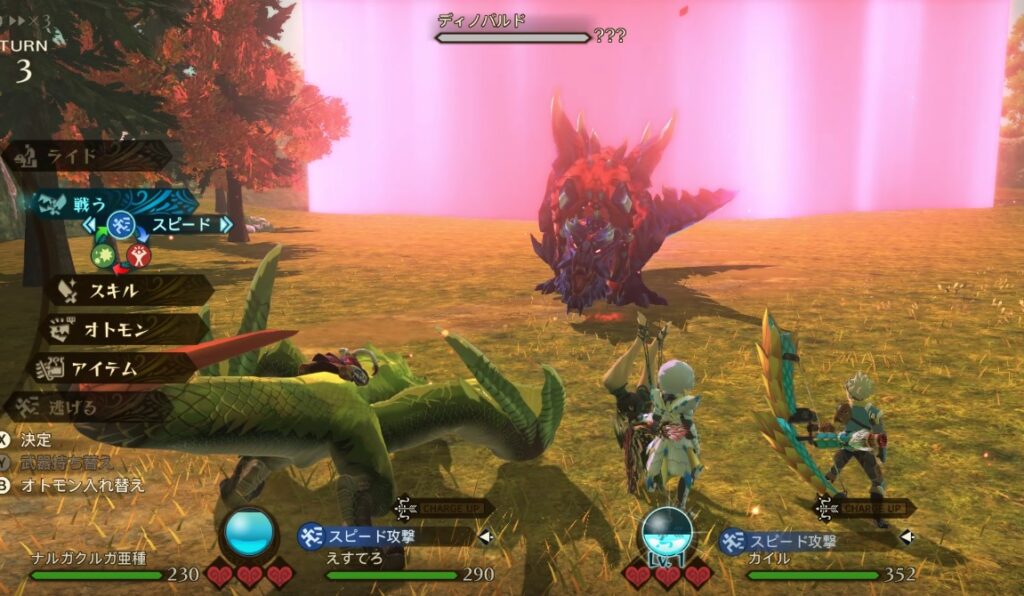 最初はドスゲネポスだけですが、しばらくするとバゼルギウスが乱入してきます。ドスゲネポスは「テクニック」を連打しておけばOK。