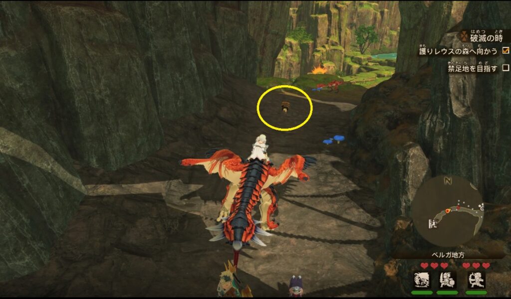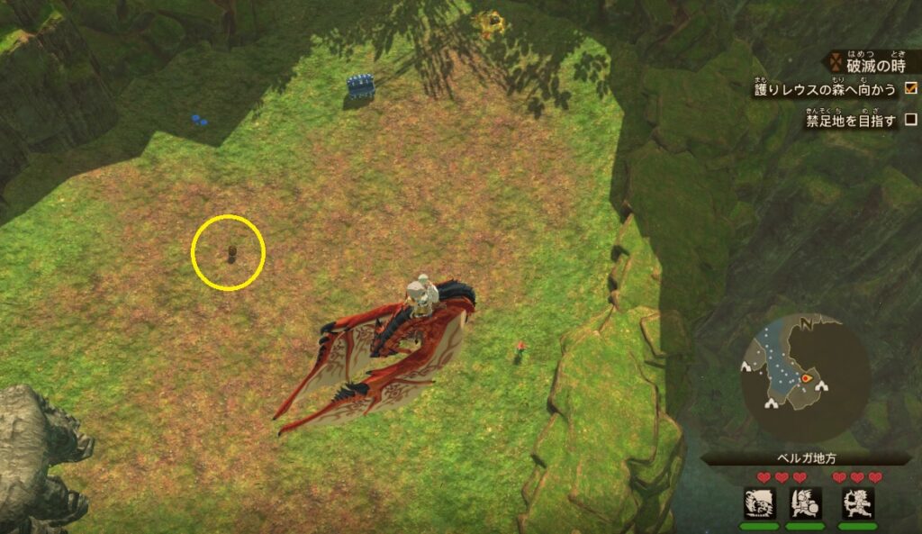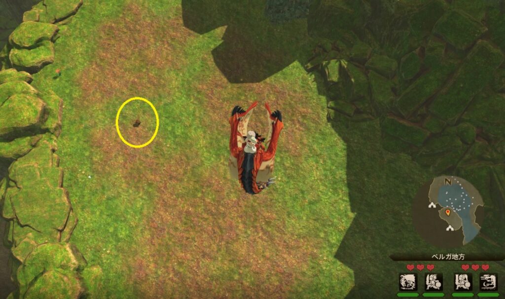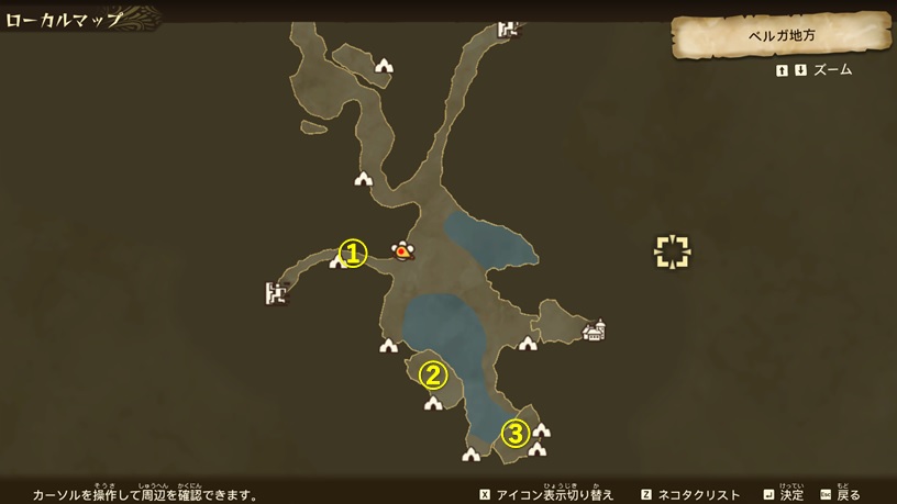 ②と③の場所は、飛行が使えるオトモンが必要ですが、飛びながらタルアイルーがいるか確認できるので非常に効率がいい。ネコタク「ベルガ火山の麓」から飛行すると、②と③を同時に確認できるので、遠めから見ていなければ再度「ベルガ火山の麓」に飛ぶ。