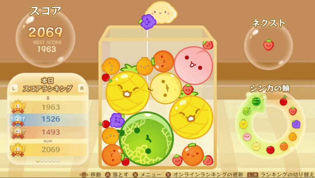 「さくらんぼ→いちご→ぶどう・・・」といった感じで果物を付けていくわけですが、シンカの輪が進むにつれて果物がどんどん大きくなるので中盤から急激に難易度が上がってきます。