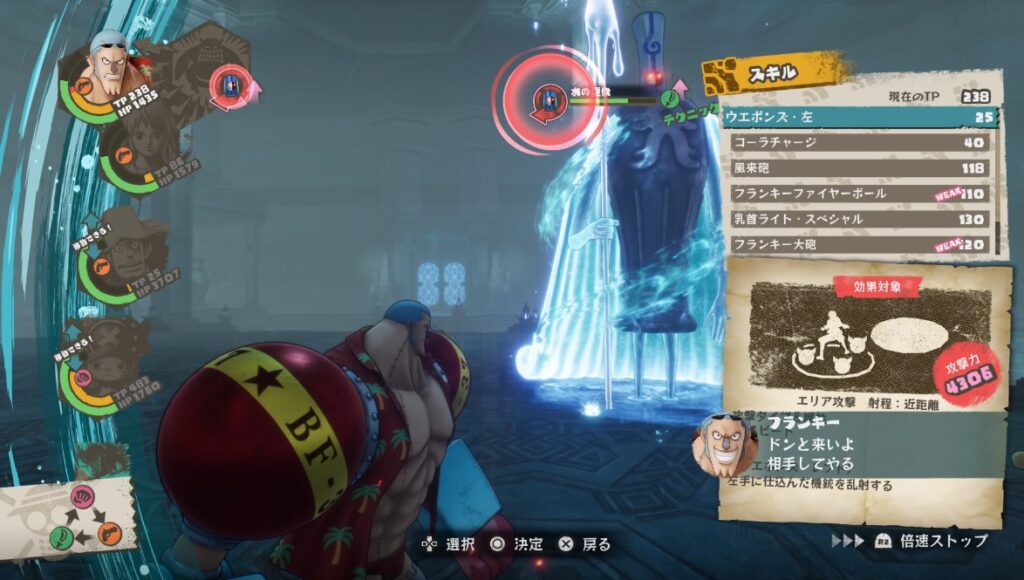 水の巨像はテクニックタイプなのでスピードタイプが有効です。また、炎も弱点となっているのでフランキーとウソップだとダメージ効率がいいです。管理人はフランキー・ウソップ・ナミ・チョッパーで倒しました。