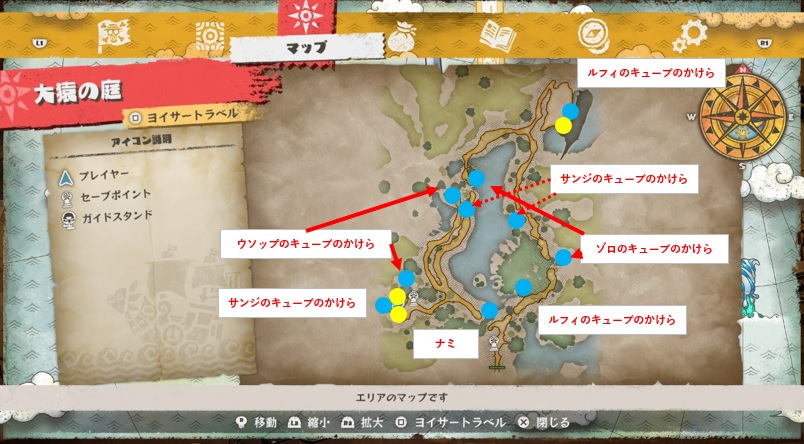 大猿の庭はゲーム冒頭で行ったエリアです。大猿の場所は最初と変わっていないのでマップ西の大猿の場所を目指しましょう。最初以降に探索していない人もいると思うのでキューブのかけら等も回収しておこう。