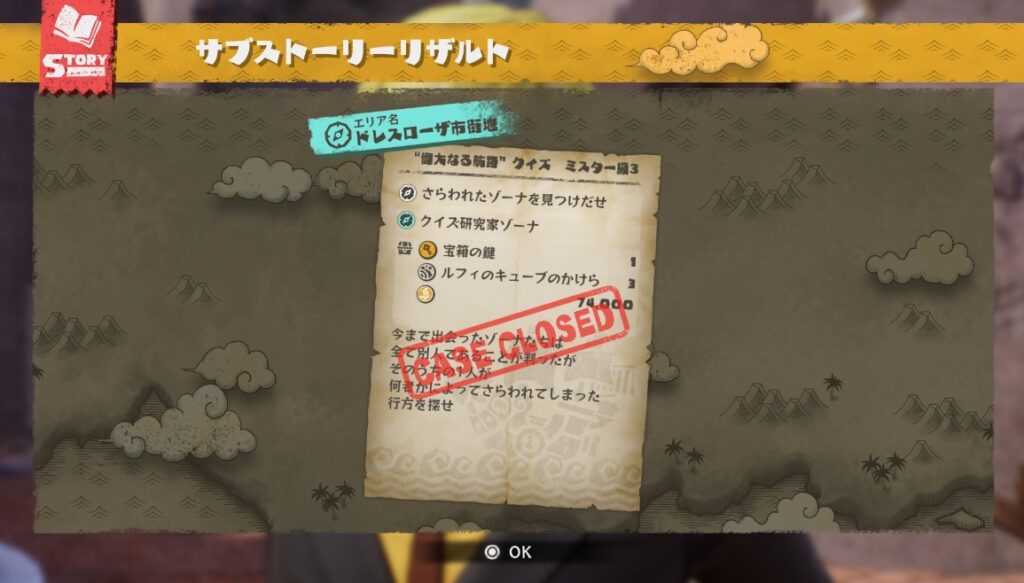 宝箱の鍵はサブストーリー「偉大なる航路クイズ ミスター級3」の報酬として手に入ります。このサブストーリーの発生時期が最終章なので、手に入れるのはかなり終盤ということになります。
