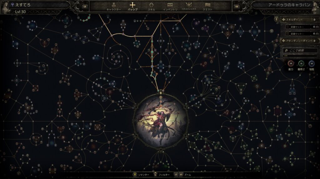 パッシブツリーで取得できるステータスとジュエルソケットについてです。ステータスとは主に「筋力」「器用さ」「知性」のことで上げるステータスによって効果が異なってきます。ざっくりまとめてますのでプレイ中の方は参考までに。