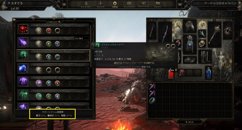 サポートジェム限度数と言うのは、スキルのソケットに装備出来るサポートジェムの装備上限のこと。サポートジェム自体が「筋力」「器用さ」「知性」とカテゴライズされていて、装備できる限度数はスキルの画面を開けば下の方に表示され確認できます。