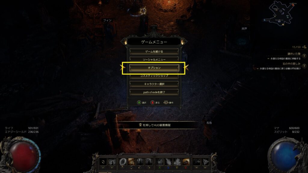 オプション設定は上の画像を出すことによって変更が可能になります。PS5だと□の上のにあるボタン、キーボードだとESCキーだと思います。