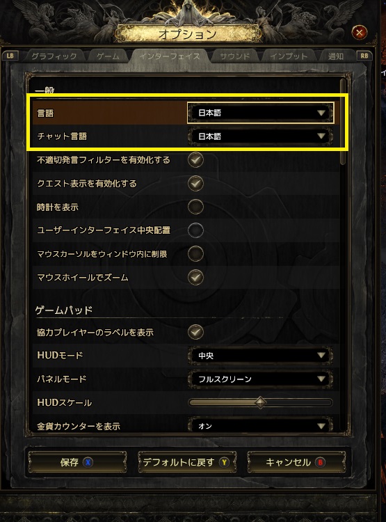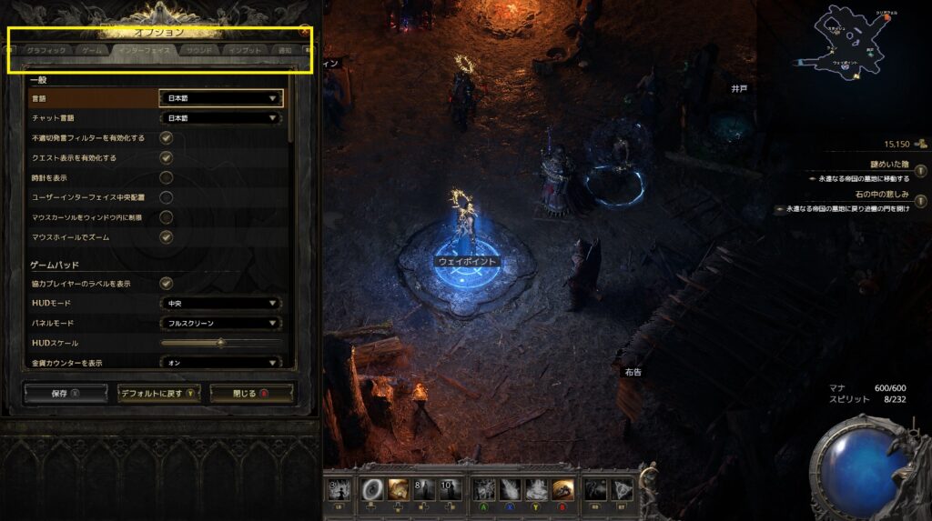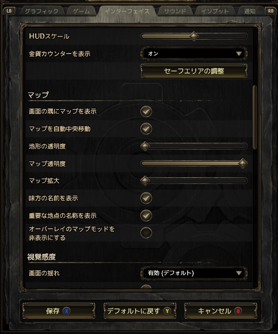 ゲーム内でプレイに直接関わってくる部分はオプションのインターフェイスのタブに集中しています。それ以外はグラフィックだったり音量の設定だったりするので、それは個人のプレイ環境に合わせて調節してみてください。