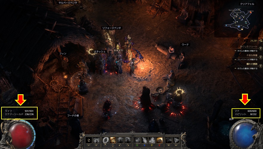 オンにすると画面下の両脇に「ライフ」「マナ」「エナジーシールド」「スピリット」が数字で表示されます。