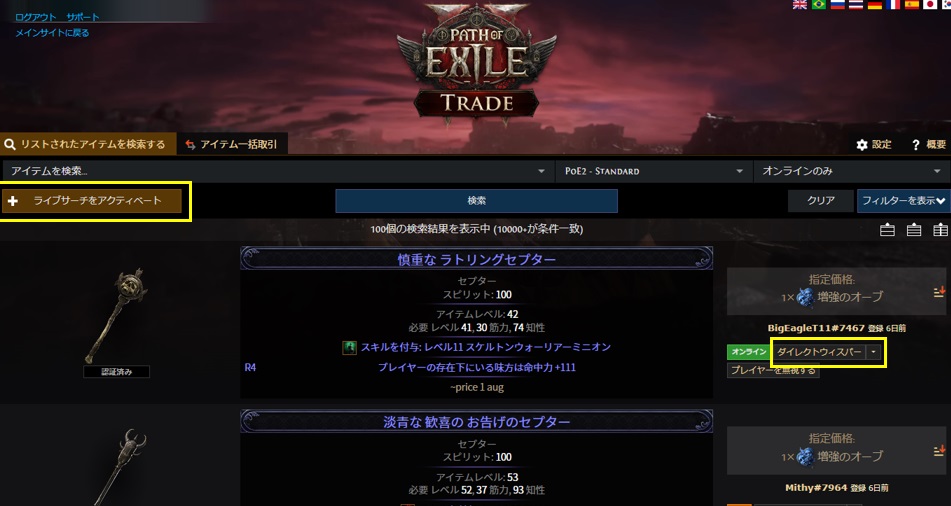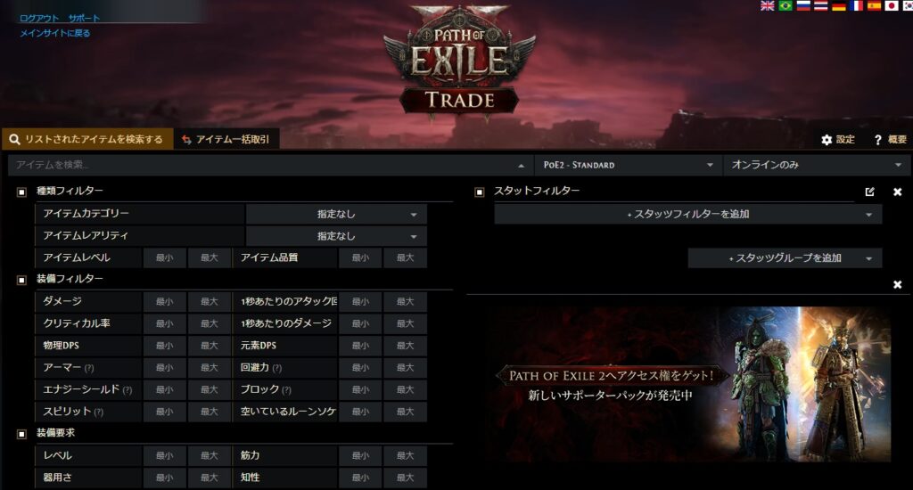 PoE2のトレードサイトにアクセスします