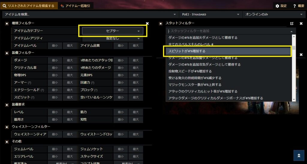 試しにスピリットが○○%増加するのモッドが付いたセプターを検索してみます。