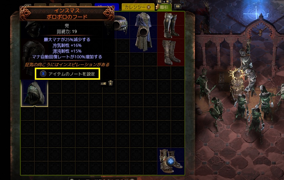 この価格で売れるわけないけどw今回は神のオーブ10個で「ボロボロのフード(ユニーク)」を設定してみました。これで例のトレードサイトに商品の登録が行われます。