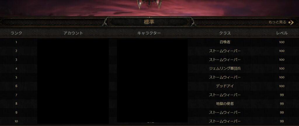 公式ページに行くと↑のような画像でランキングみたいなものが確認できます(一応、アカウントとキャラクター名は隠しておきます)。何をもってランクを付けているかというと、おそらくレベル。