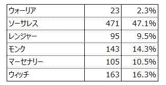 とまあ、ストームウィーバーの多さに目が行くわけですが個人的に気になったのがランキング1000人に入らなかったクラスが1つもないということです。突き詰めればどのクラスでもエンドゲームで戦える状況にはあるわけで、最初にストームウィーバーを選ばなかったからといってそこまで悲観する必要もない気がします。