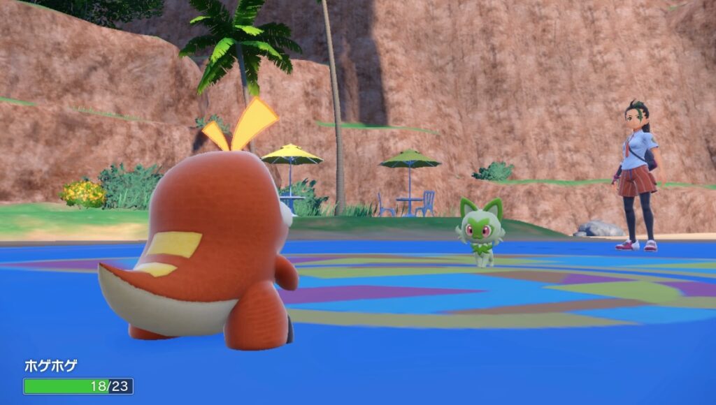 ポケモンを選んだら下のビーチでネモとポケモンバトル。ネモはこちらのポケモンと相性がいいものを選んでくれるので勝つのは簡単です。