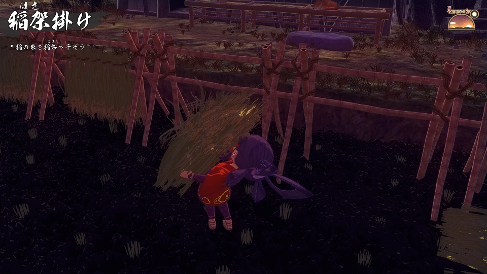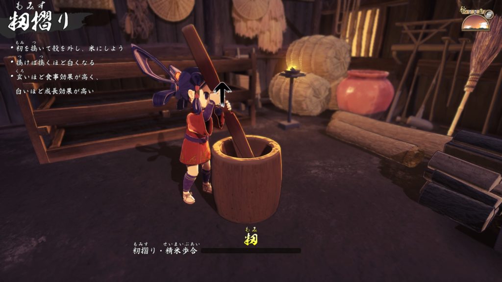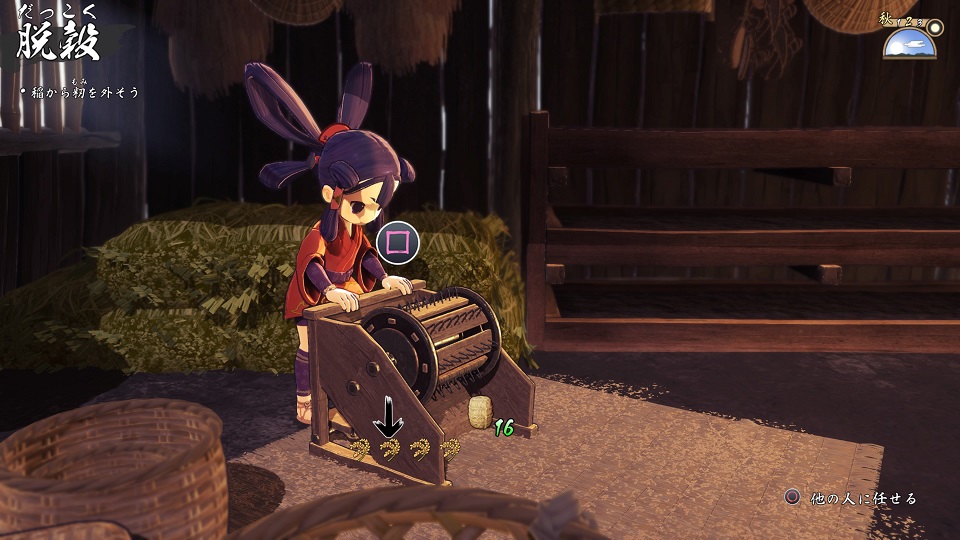 乾いた稲を納屋に運んだ後にする作業。最初はこき箸なので指が疲れるんですが、ストーリーを進めるにつれ「千歯こき」「足踏み脱穀機」と農具が増えて劇的に楽になる。