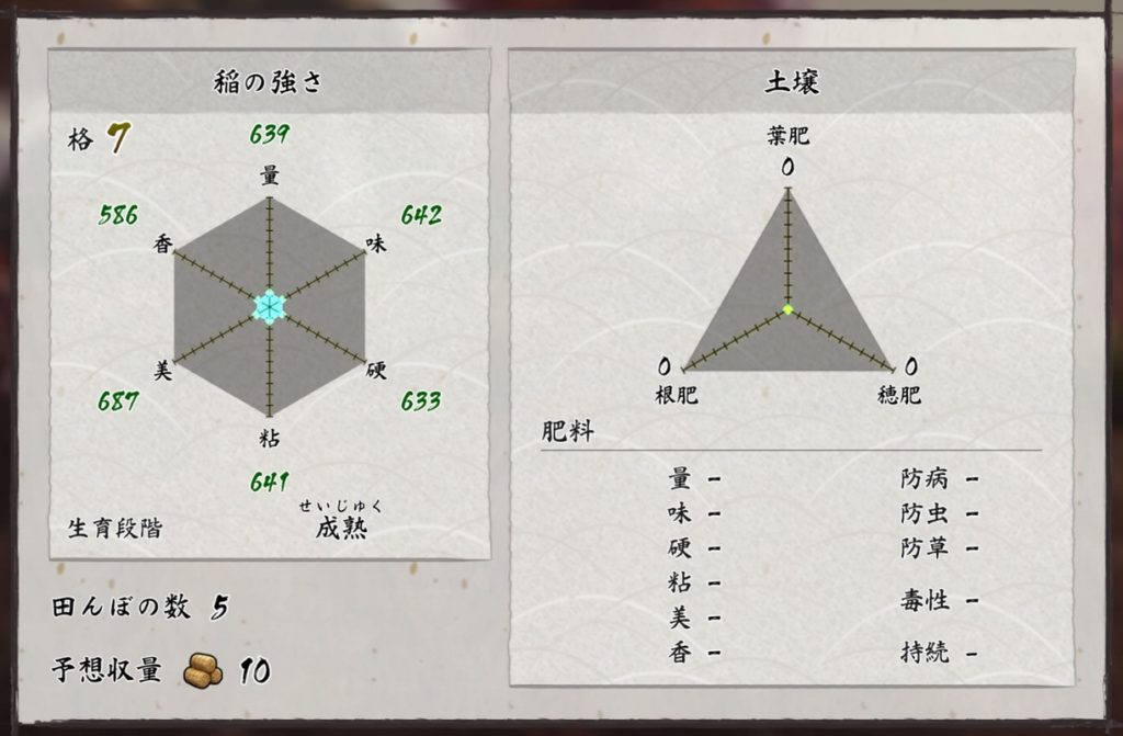 お米の質とサクナのステータスは密接に関わっていて、上記の表がその相関です。運気だけがちょっと曖昧なのですが、おそらくこの認識で間違っていないと思う。