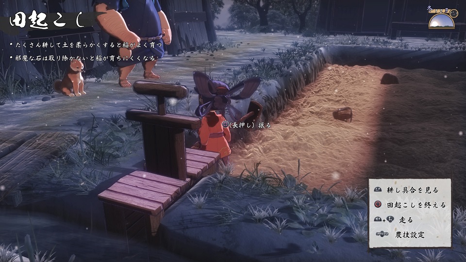 土を柔らかくして稲が育ちやすくする作業。耕すと同時に落ちている石も必ず除去します。サクナのセリフで大まかな耕し具合が分かりますが「完璧じゃ~」でも95%くらいなので油断は禁物です。