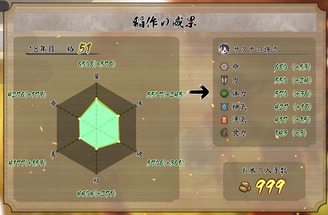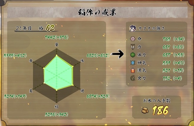 あまり深く考えずに稲作した時との比較結果です。「量」が大幅に減って「味・硬・粘」が大幅に増加してますね。何故か「香」も爆上がりしてますが…。