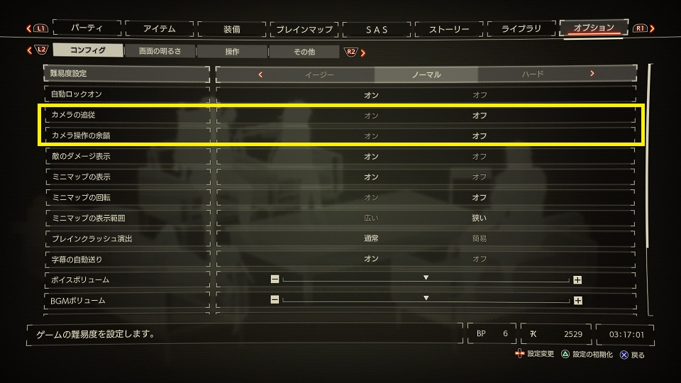 の項目をオフにすると、多少は改善されるかもしれません。オンのままだと不必要にカメラがグルグル回ってしまうので3D酔いの原因になります。映像も細かくて綺麗だから、余計に酔いやすいんですよね。