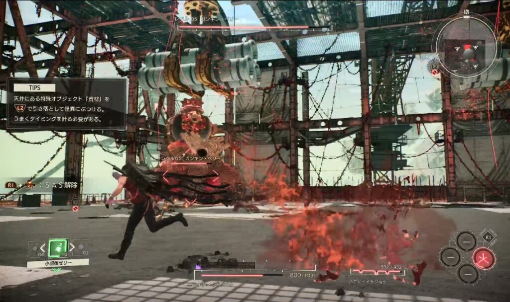 相手がジャンプして飛んで来た後に、地面でジタバタしてたらギミックを落とすチャンスです。ギミックを落とすのに成功すると敵が油まみれになるので、ハナビのSAS「発火」を使って追撃でダメージを入れていきましょう。