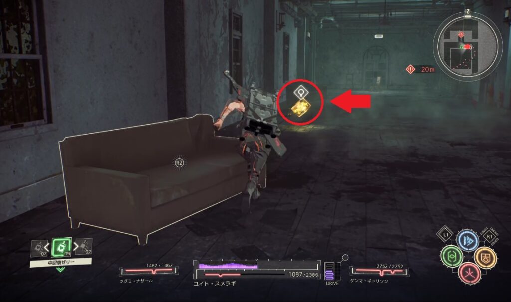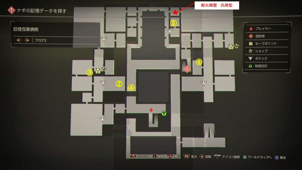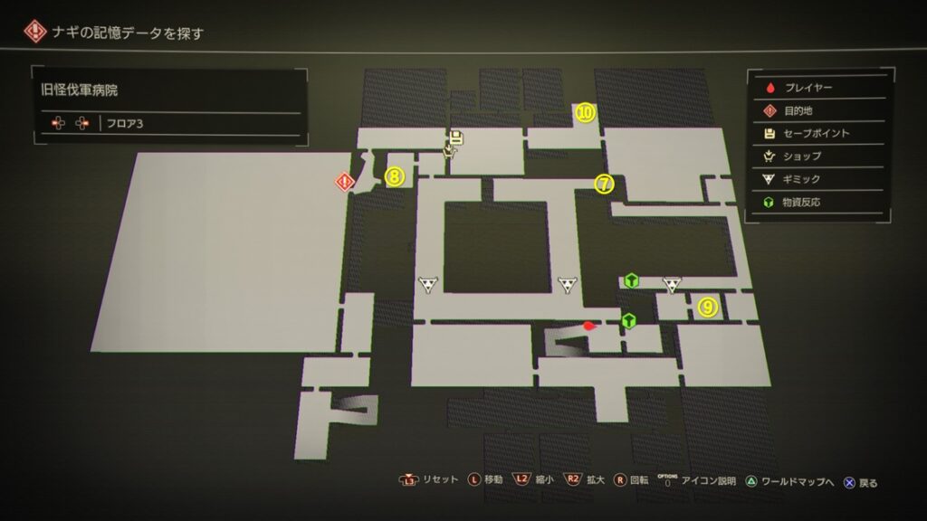 この後は、ワールドマップからすぐに旧怪伐軍病院へ行くこともできますが、「スオウ京 大通り」のマップが探索できます。物資反応(緑のアイコン)が更新されているので、旧怪伐軍病院へ行く前に回収しておくのがオススメです。