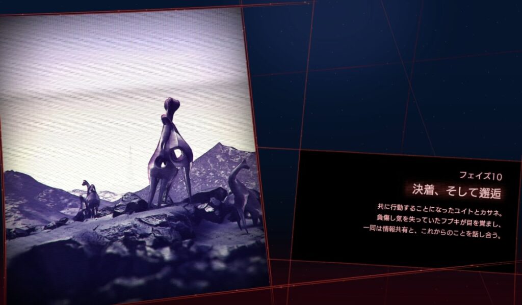 逃げ切った後は、ワールドマップから「クナド高速輸送道路 パーキングエリア」へ。会話イベントの後は、アジトに戻りスタンバイフェイズ10に。