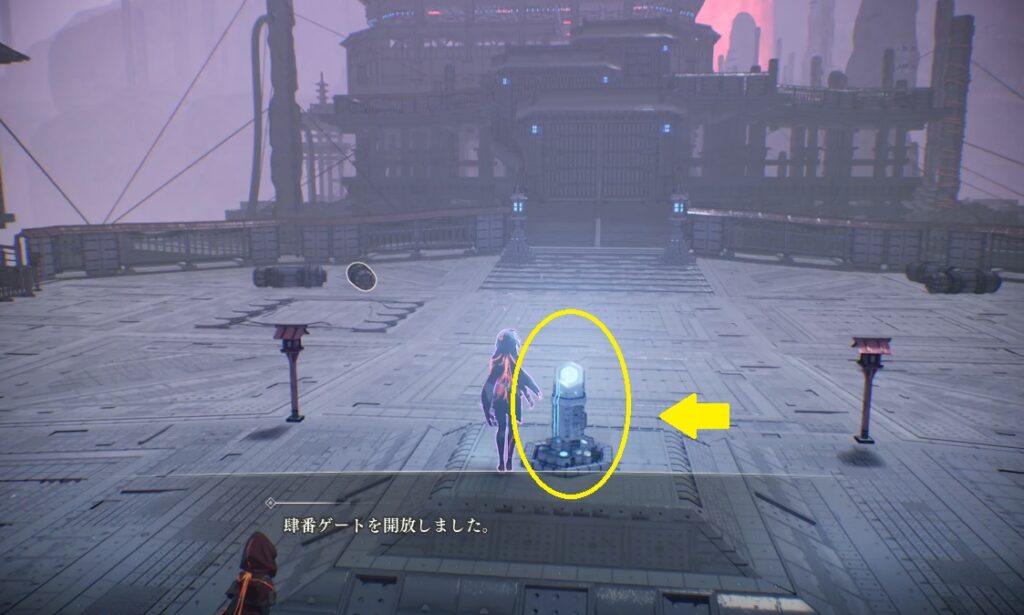 ゲートを開ける起動装置が全部6か所。先に進めない場合は、どこかの装置を起動していないのでマップを見て探す。マップ上で通路とかにないギミックマークは大抵これなので、迷ったらマップを開いてみてください。