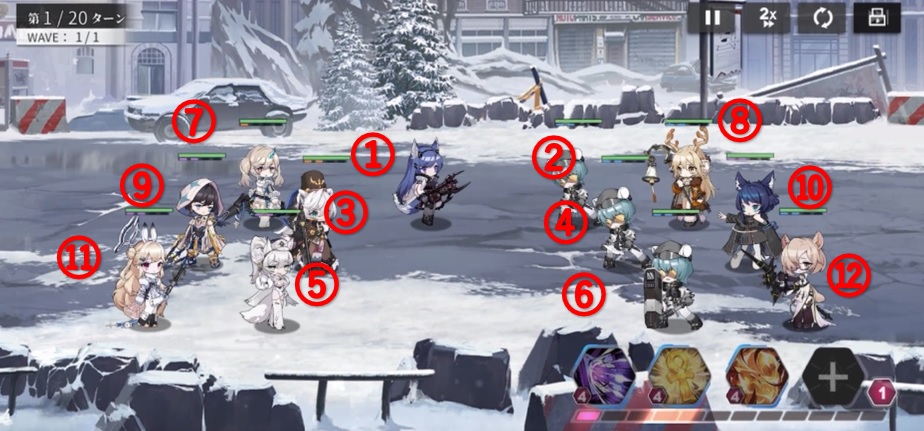 ということになります。特に火力が高いキャラは前列の上に配置すると、攻撃順が回ってくるのも早いので先に敵を倒せる可能性が上がるということです。