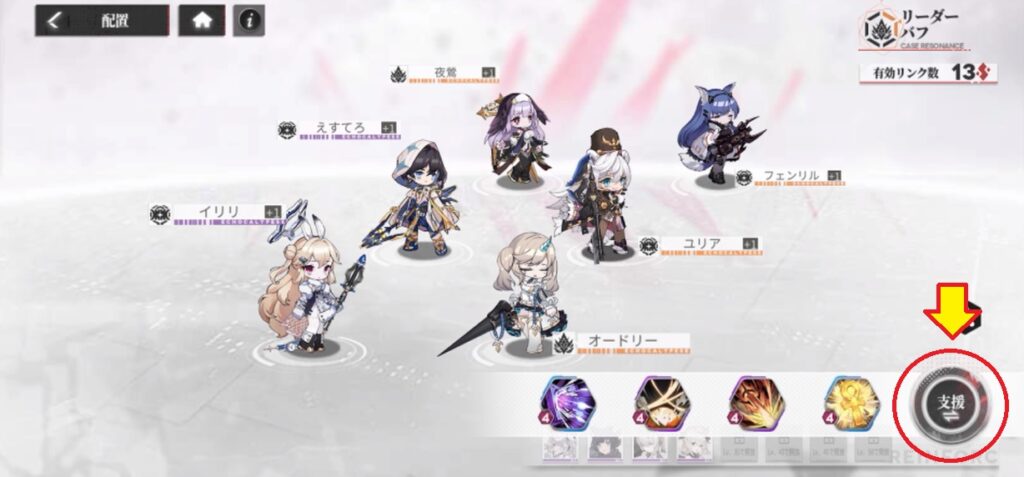 配置画面を開くと右下に「支援」というボタンがあります。ここをタップするとバトルには参加しませんがリンクの恩恵だけが得られるキャラを設定できます。