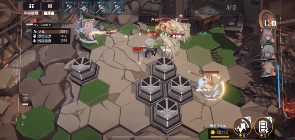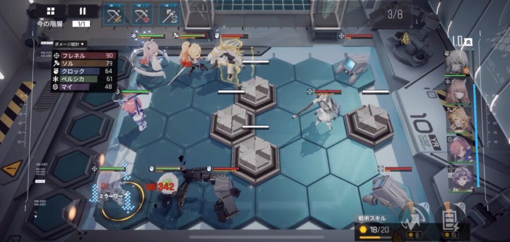 ゲーム中のバトルに関しては、編成したキャラクターをマス目配置し戦うもの。各キャラはオートで戦闘を行いプレイヤーが介入できる部分は戦術スキルを指定のキャラに使ったりとか、各キャラの必殺技を使ったりとか。