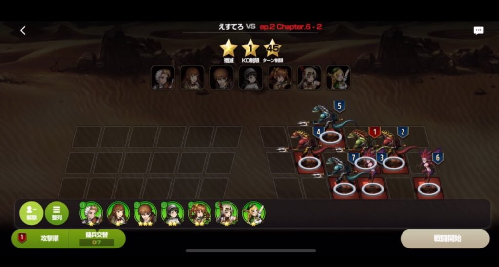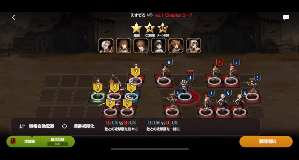 その為、ゲーム開始からチャプター5(ストーリー)をクリアするまでは、ずっと固定キャラを使い続けることになります。ただ、序盤のステージでもそこそこ難易度が高く進めづらいのが個人的にはマイナスポイントかなと思う。