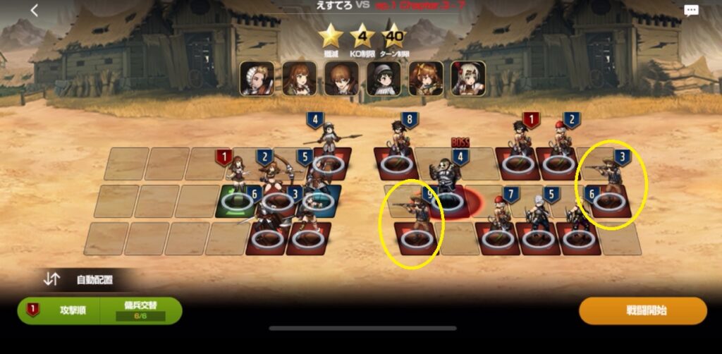 自軍キャラの行動順は自由に変えられます。なので、ライフルを撃たれる前に倒せるように配置しましょう。ライフルの敵はHPは低いので基本的には一撃で倒せると思います。