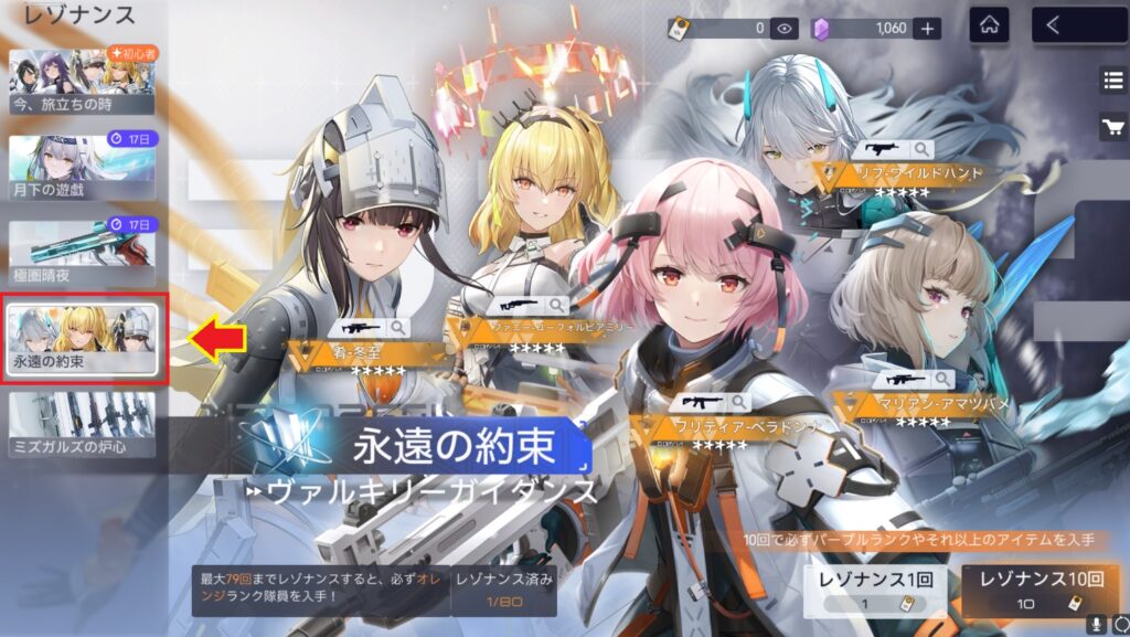 本気でリセマラをやるのであれば【永遠の約束】を回しておくのがいいと思う。初心者ガチャの【今、旅立ちの時】は50回で天井なのでこちらは残しておくのがいいかも。