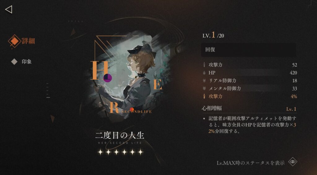記憶者が範囲攻撃のアルティメットを発動すると、味方全員のHPを記憶者の攻撃力×32%分回復する。