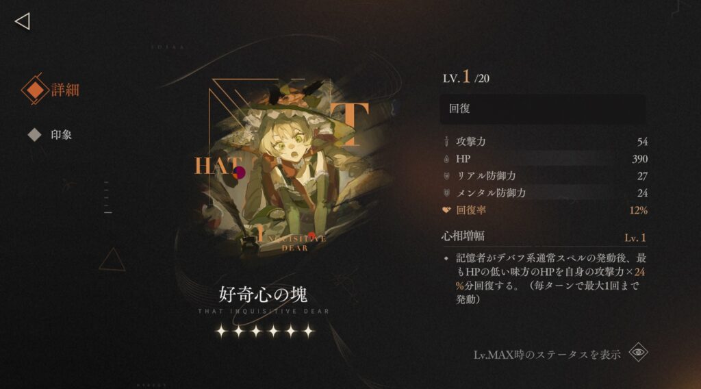 記憶者がデバフ系通常スペルの発動後、最もHPの低い味方のHPを自身の攻撃力×24%回復する。(毎ターン最大1回まで発動)